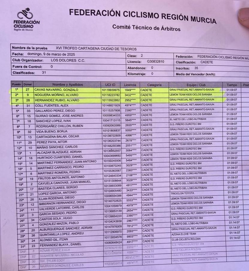 Gonzalo Cavas (Grau Pascual-Saxun) se ha impuesto esta mañana en el XVI Trofeo Cartagena Ciudad de Tesoros para ciclistas cadetes. Álvaro Noguera (Lemon) ha sido segundo y Álvaro Hernández (Grau Pascual-Saxun) ha completado el podio.