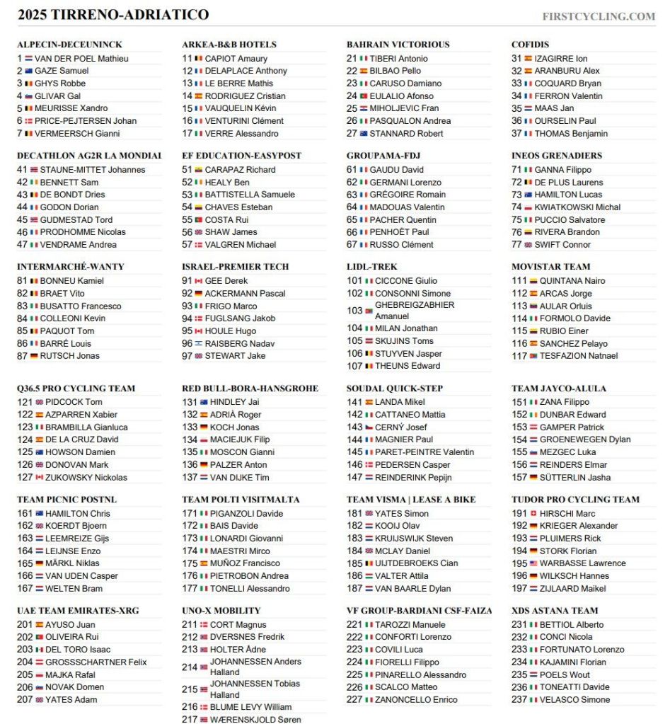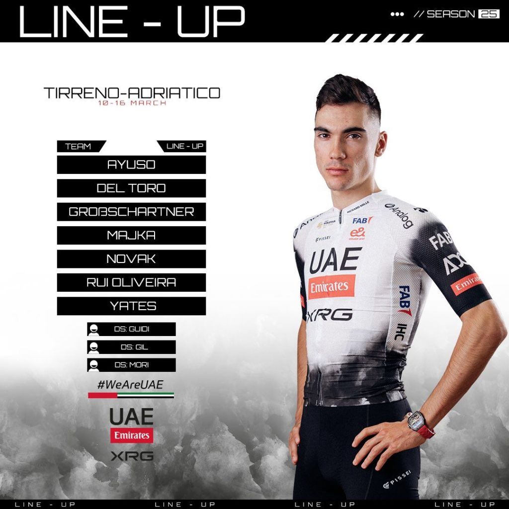 También acuden a la cita italiana Mathieu Van der Poel, en su fase de preparación para la Milán San Remo, el británico Thomas Pidcock, segundo el pasado sábado en la Strade Bianche, el ecuatoriano Richard Carapaz, el francés David Gaudu e incluso el británico Adam Yates en el UAE de Ayuso.