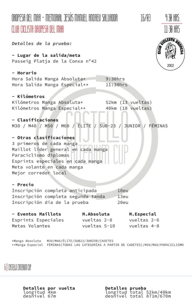 El domingo, 16 de marzo, se disputa en Oropesa del Mar el Memorial Jesús Manuel Andreu Salvador, primera prueba de la recién creada Castellón Critérium Cup. Una competición que tendrá continuidad en las localidades de La Vall d’Alba y Sant Jordi y que pretende convertirse en un clásico del ciclismo máster en la provincia de Castellón. Vicent Perales, el Club Ciclista Oropesa del Mar y el Club Ciclistas Dos Rodes llevan la bandera de esta competición tan atractiva.
