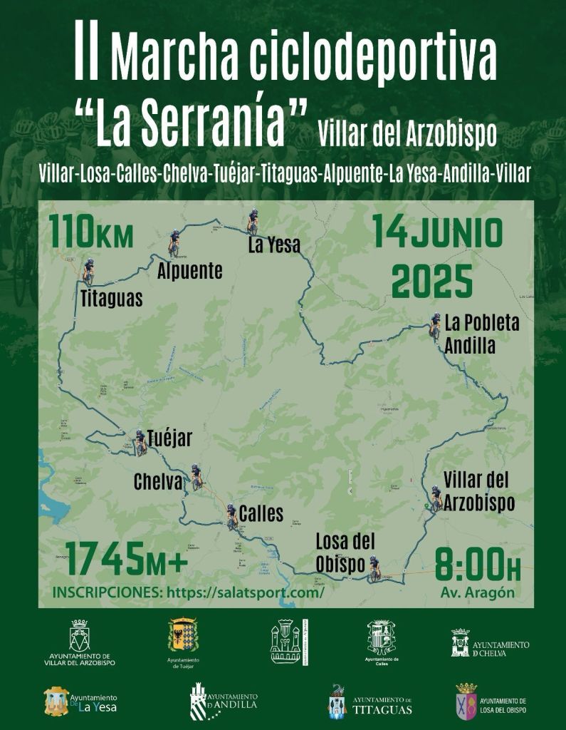 La II Marcha Ciclodeportiva La Serranía ya tiene fecha. Bajo la organización del Club Deportivo La Serranía se disputará el próximo 14 de junio a partir de las 8:00. Tendrá salida y llegada en la población de Villar del Arzobispo. Serán 110 kilómetros de recorrido con una desnivel positivo de 1.745 metros. Una vez más se afrontará el tramo cronometrado en el que los más rápidos serán obsequiados con atractivos premios.