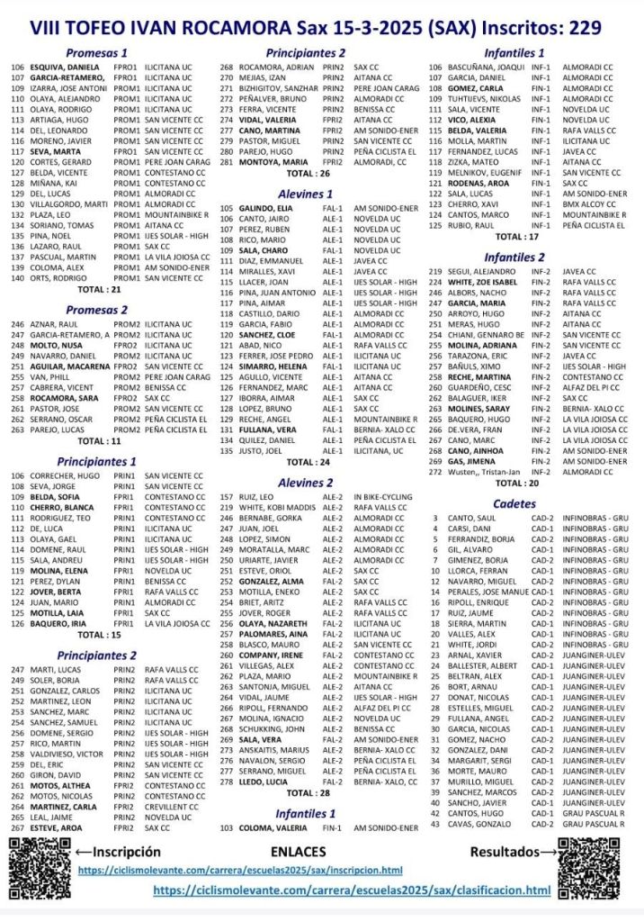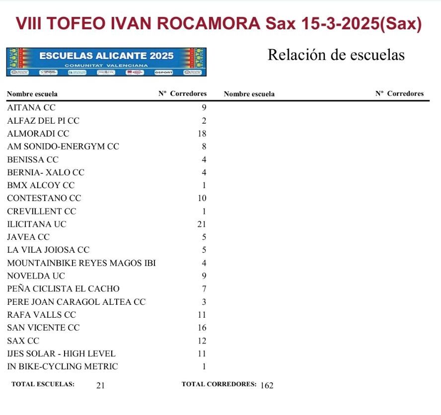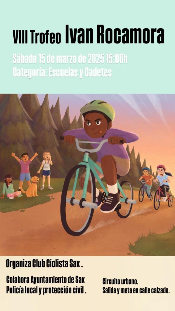 El sábado se disputa en Sax el 𝗩𝗜𝗜𝗜 𝗧𝗿𝗼𝗳𝗲𝗼 𝗜𝘃𝗮𝗻 𝗥𝗼𝗰𝗮𝗺𝗼𝗿𝗮 para Escuelas y Cadetes. La prueba, que comienza a las 15 horas es puntuable para la Challenge de Escuelas de la provincia de Alicante. El CC Sax, organizador de la competición, ha diseñado un circuito urbano con salida y meta en la calle Calzado de la localidad alicantina.