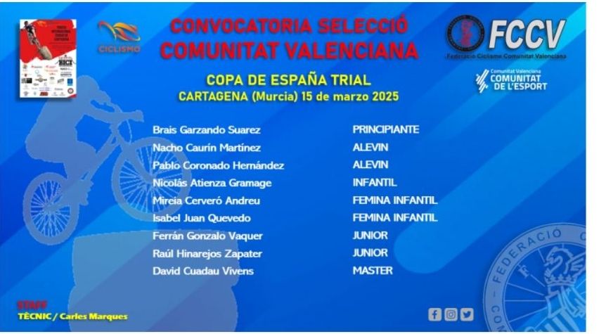 La Federació de Ciclisme de la Comunitat Valenciana hace pública la lista de corredores seleccionados para representar a la Comunitat Valenciana en la primera prueba de la Copa de España de Trial. El Trofeo Internacional Ciudad de Cartagena tendrá lugar este próximo sábado 15 de marzo en la localidad murciana.
