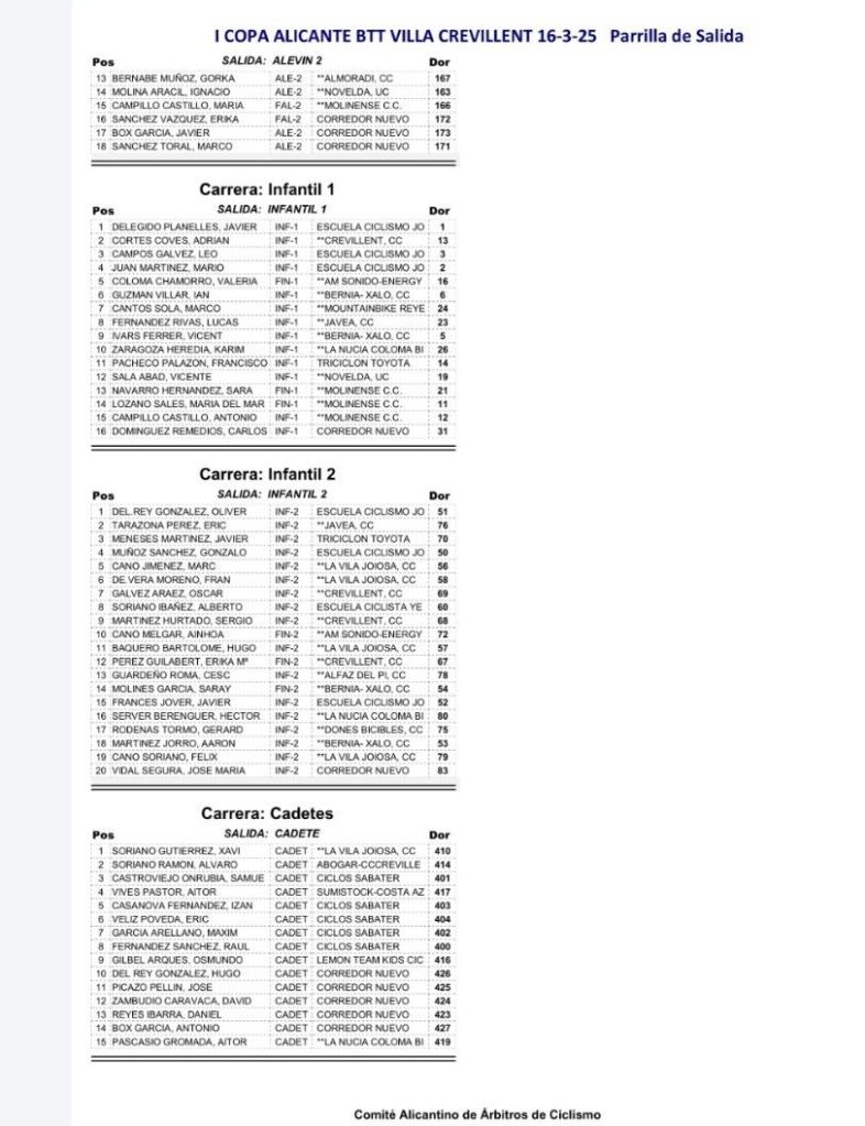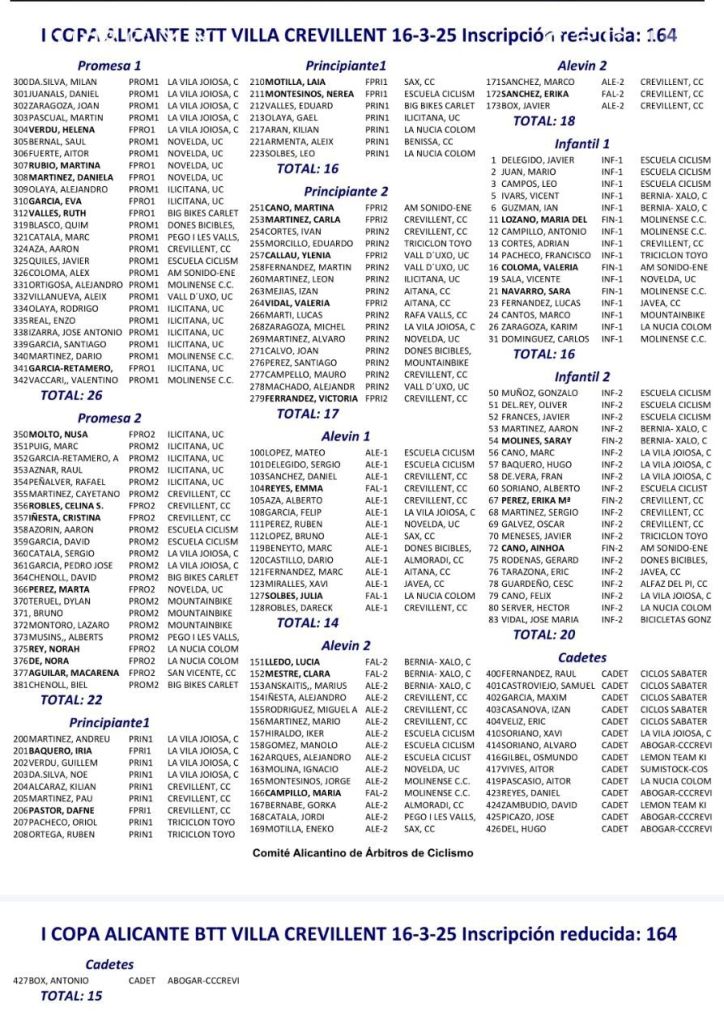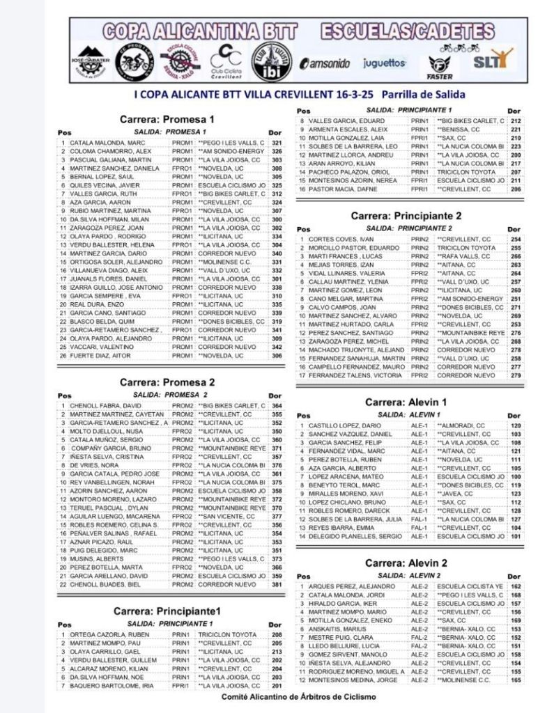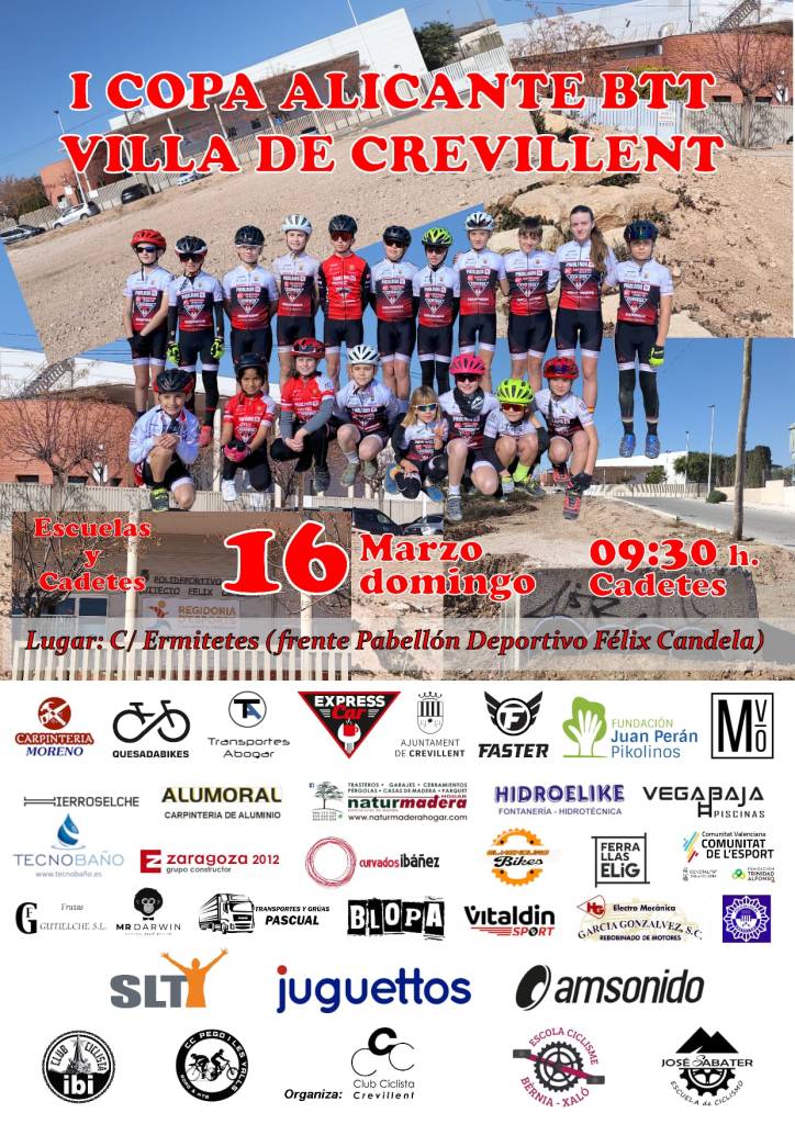 El domingo, 16 de marzo, se disputa el Villa de Crevillent, tercera prueba de la I Copa Alicante BTT de Escuelas y Cadetes. La competición se realizará en la calle Ermitetes, frente al Pabellón Deportivo Félix Candela. Se han inscrito 64 bikers, de los que 15 son de la categorí cadete. Comenzará a las 9.30 con los cadetes