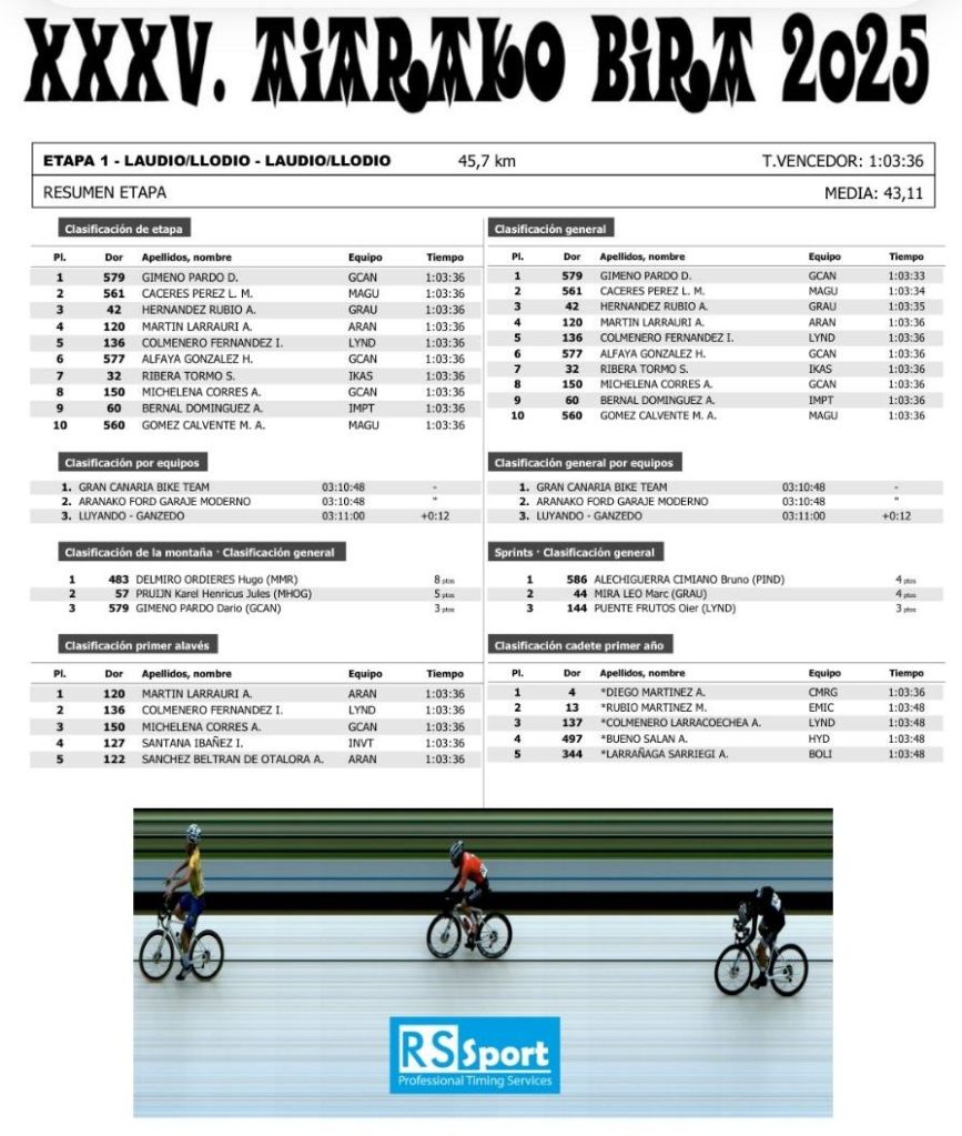 Darío Gimeno (Gran Canaria Bike Team) se ha impuesto en Laudio en la primera etapa de la 35 edición de la Aiarako Bira 2025, para ciclistas cadetes, disputada sobre 45,7 kilómetros de recorrido. Luis Manuel Cáceres (Maguisa Guijuelo) ha sido segundo y Álvaro Hernández (Grau Pascual Saxun) ha completado el podio de la jornada. Séptima posicición de Sergi Ribera (Ikascola TX. AEl).
