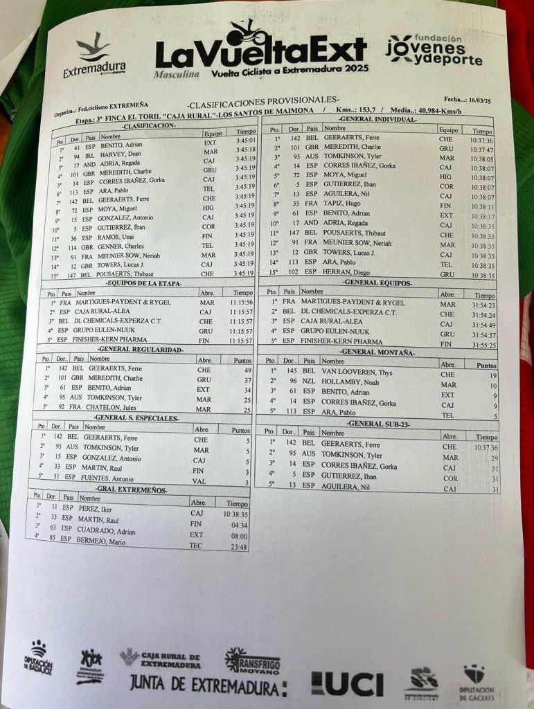 Etapa 3: 16 de marzo | Etapa 3: Finca El Toril / Carrascalejo – Los Santos de Maimona (153,9 km) Clasificaciones