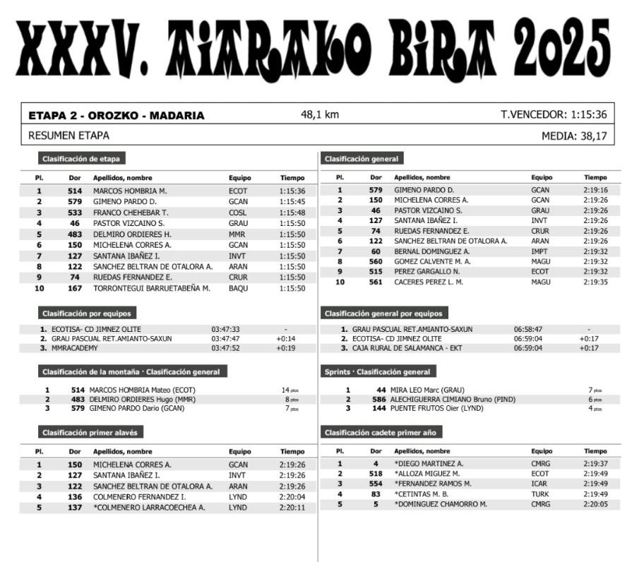 Mateo Marcos (Ecotisa) se ha impuesto en Madaria en la segunda etapa de la 35 edición de la Aiarako Bira 2025, para ciclistas cadetes, disputada sobre sobre una distancia de 48,1 kilómetros de recorrido y que ha partido de Orozco. Darío Gimeno (Gran Canaria) ha sido segundo y sigue de líder, mientras que Tomás Franco (Coslada) ha terminado tercero. Cuarta plaza para Samuel Pastor (Grau Pascual Saxun), que ha finalizado cuarto. En la general el corredor alicantino es tercero.