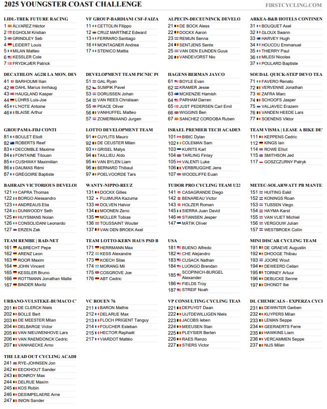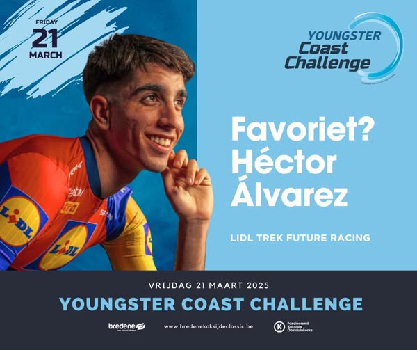 Héctor Álvarez (Lidl Trek Future Racing) estará hoy viernes en la Youngster Coast Challenge que llevará al pelotón desde Bredene a Koksijde en tierras belgas. Lista de participantes. El benidormense es considerado como uno de los favoritos para levantar los brazos en meta y partirá con el dorsal número uno. El Youngster Coast Challenge, también conocida como Handzame Challenge IC, es una carrera ciclista sub-23 de un día que se disputa en la provincia de Flandes Occidental.