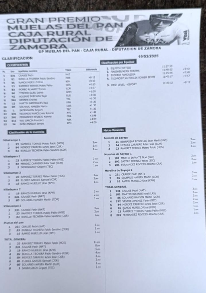 El corredor sudafricano del Natural Greatnes, Pedro Crause, se ha impuesto hoy en solitaario en el Gran Premio Muelas del Pan – Caja Rural – Diputación de Zamora para ciclistas élite y sub-23. Pablo Bonilla (Cortizo) ha sido segundo y Unai Ramos (Finisher), segundo. La montaña ha sido para Mateo Pablo Ramírez (High Level Gsport) y las Metas Volantes, Crause. Destacar el debut como el maillot del High Level Gsport Alejandro Merenciano.