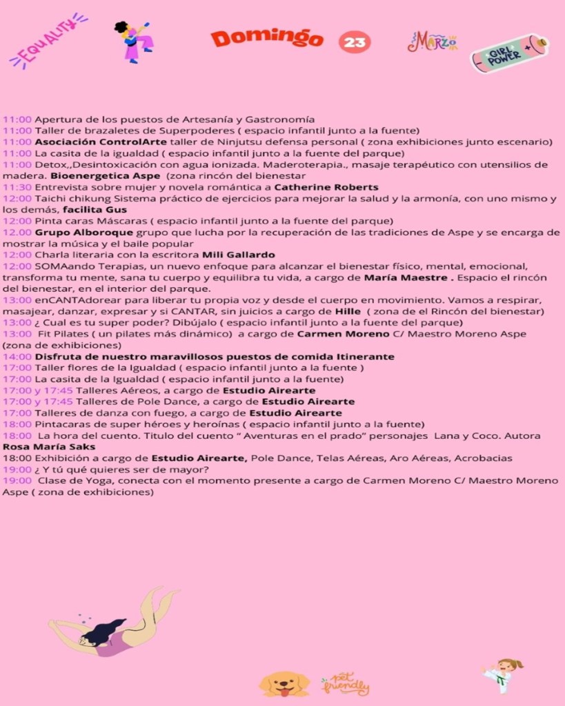 La «Marcha en Bici de la Mujer» de Aspe cumplirá el domingo, día 23 de marzo, su cuarta edición. La salida y meta estarán situadas el Parque Doctor Calatayud de Aspe. Serán 25 kilómetros de recorrido y un desnivel de 300 metros. El banderazo de inicio de dará a las 9 horas. Organiza el CC Hornagirls con el apoyo de la Concejalía de Igualdad del Ayuntamiento de la localidad alicantina. La prueba se disputa en el marco de la conmemoración del Día Internacional de la Mujer al igual que la Feria del Emprendimiento Femenino que cuenta con un amplio programa de actividades.