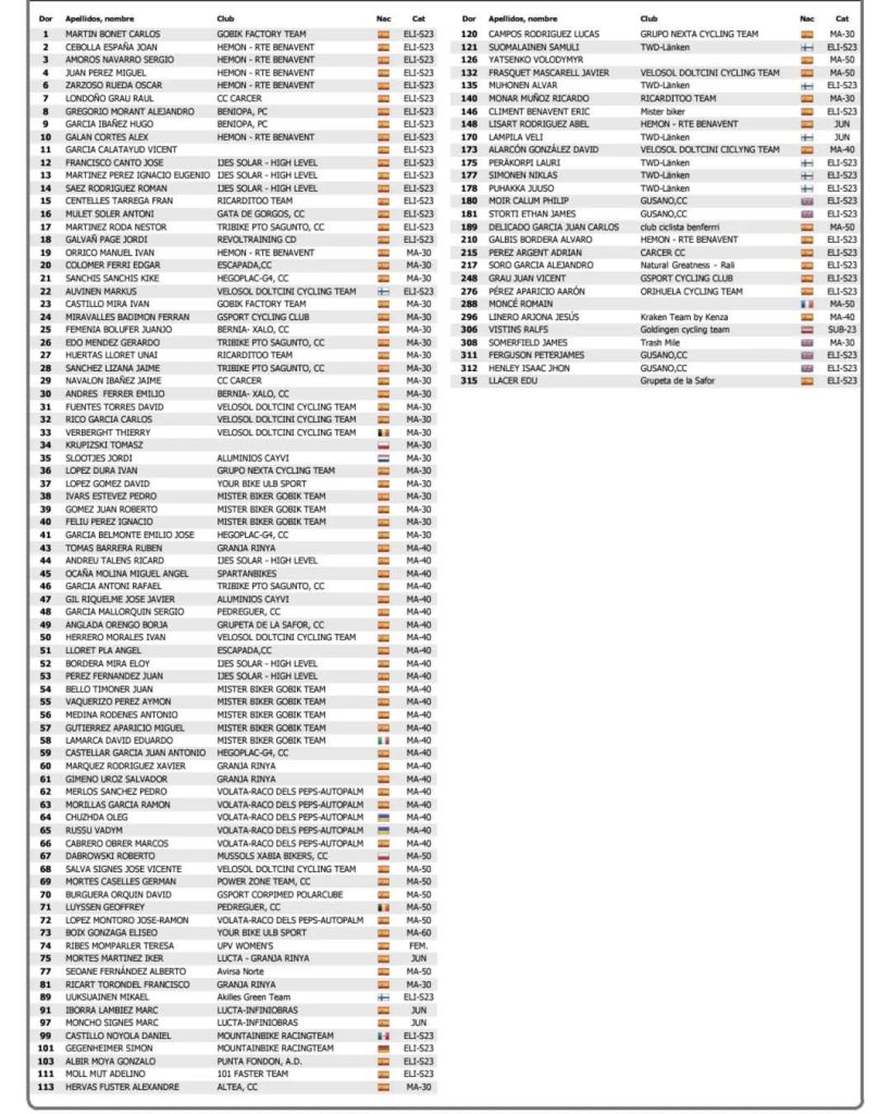 Joan Cebolla (Hemon Restaurante Benavent) está al frente de la Volta La Marina y es el mejor élite; Tomasz Krupizski domina en M30; Eloy Bordera, en M40; Germán Mortes, en M50; y Elíseo Boix, en M60. Markus Auviken comanda la clasificación por Puntos, Francisco Ricart, la Montaña, mientras que el Hemon Restaurante Benavent es la mejor escuadra.