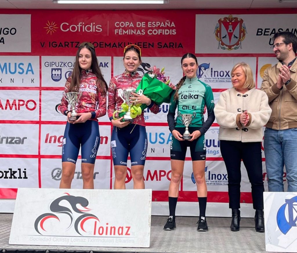 En lo que se refiere a la categoría cadete, el Baix Ter Women’s Academy ha dado todo un recital. Lluna Jiménez y su compañera Valeria Piñol saltaban en las primeras rampas de Lierni y se marchaban en busca de la victoria con una amplia diferencia respecto al pelotón. Ya en la ascensión a Olaberria, Jiménez dejaba de rueda a Piñol, encaminándose así al triunfo en Beasain. Piñol llegaba a 1:05, y Carla Bañuls vencía en el sprint de un quinteto para alzarse a la tercera posición del podio. Maixa Odriozola, novena en el día de hoy, se viste como nueva líder. Octava, Sara Calatrava; Adriana Segura (Valverde Team), 13; y Nayara Ibáñez (Hostal Savoy Ulevel), 14.