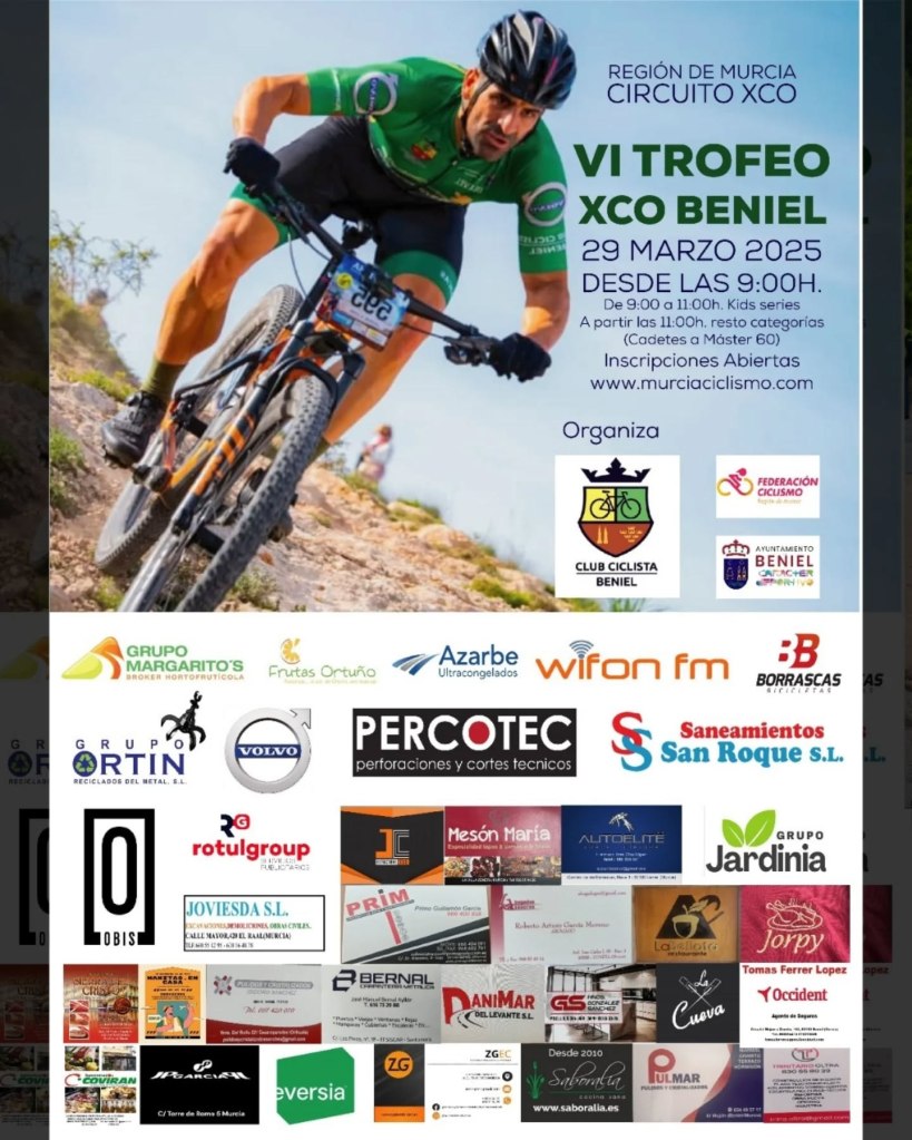 Llegó el momento de dar el pistoletazo de salida al Circuito XCO Región de Murcia. El VI Trofeo XCO Beniel acoge la apertura del calendario 2025 este sábado desde las 9:00 horas. La competición se desarrollará en el Paraje de La Fuentecica. La representación de bikers de la Comunidad Valenciana será muy amplia. Ver lista de inscritos.