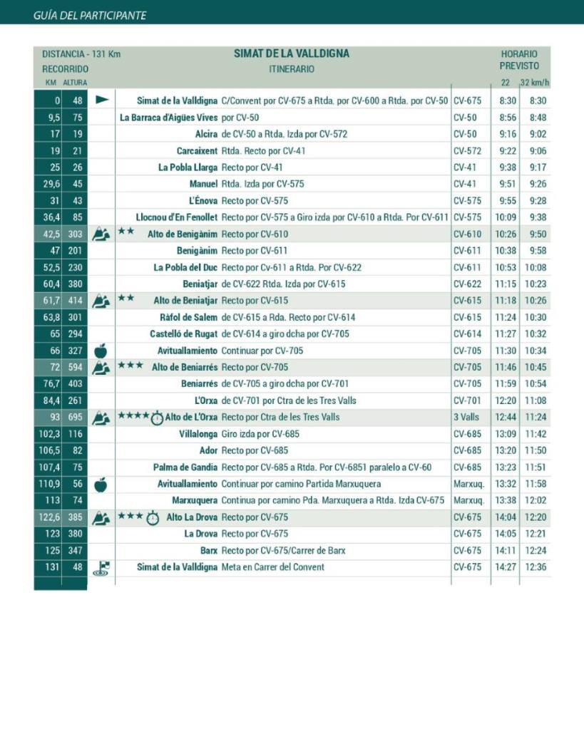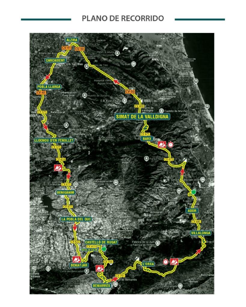 El recorrido es de 130 kilómetros con algo más de 1800 m+ de desnivel repartidos en 5 puertos: Benigànim, Beniatjar, Beniarrés, L’Orxa y La Drova. Los dos últimos serán tramos cronometrados. La salida y llegada estarán situadas en la localidad de Simat de la Valldigna. La salida se dará a las 8.30 horas.