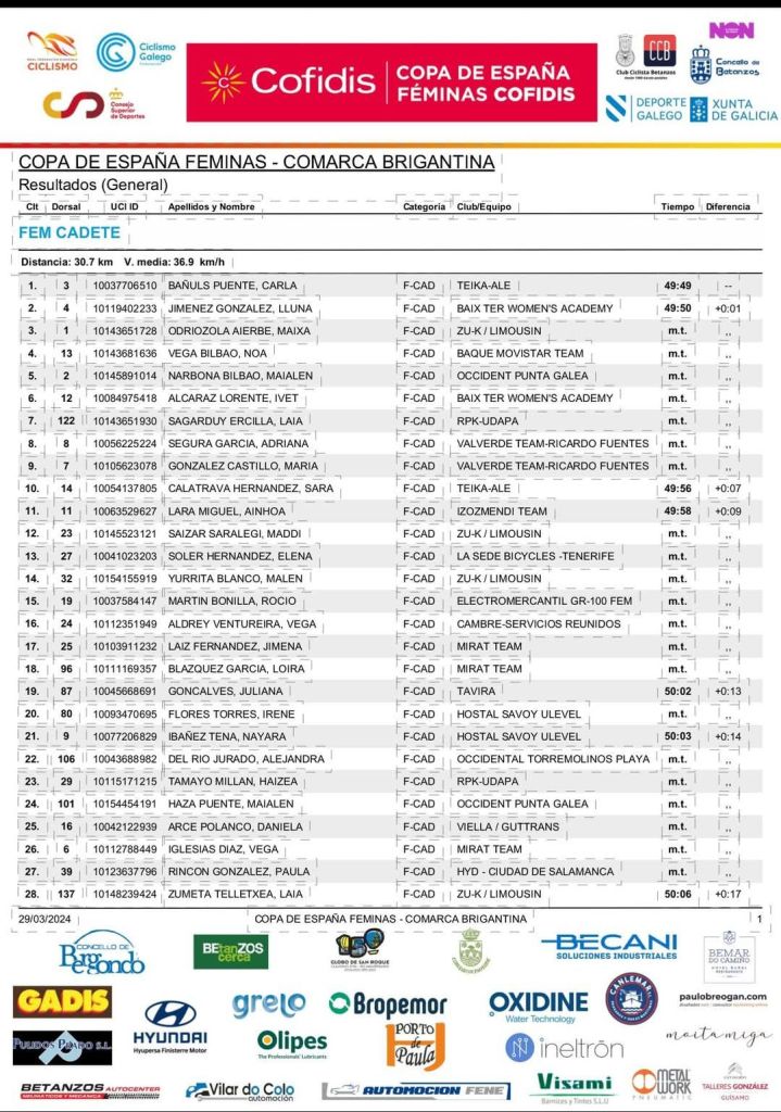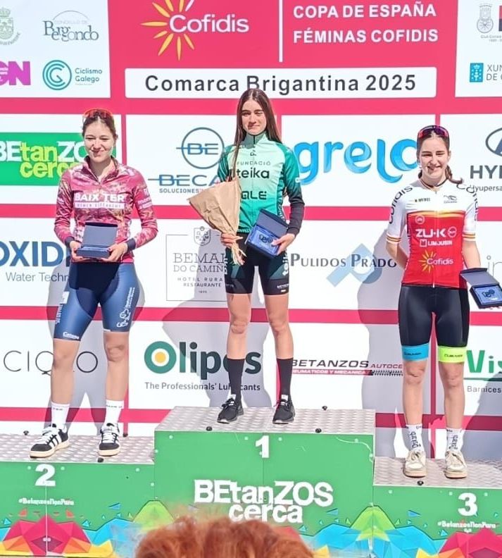 Carla Bañuls (Teika-Alé) gana a lo grande en la prueba cadete de la Copa España Femenina. En el muro de Betanzos se ha impuesto con superioridad a Lluna Jiménez y Maixa Odriozola. Odriozola sigue como líder del Torneo Nacional. Octava plaza para Adriana Segura (Valverde Team) y décima de Sara Calatrava (Teika-Alé).