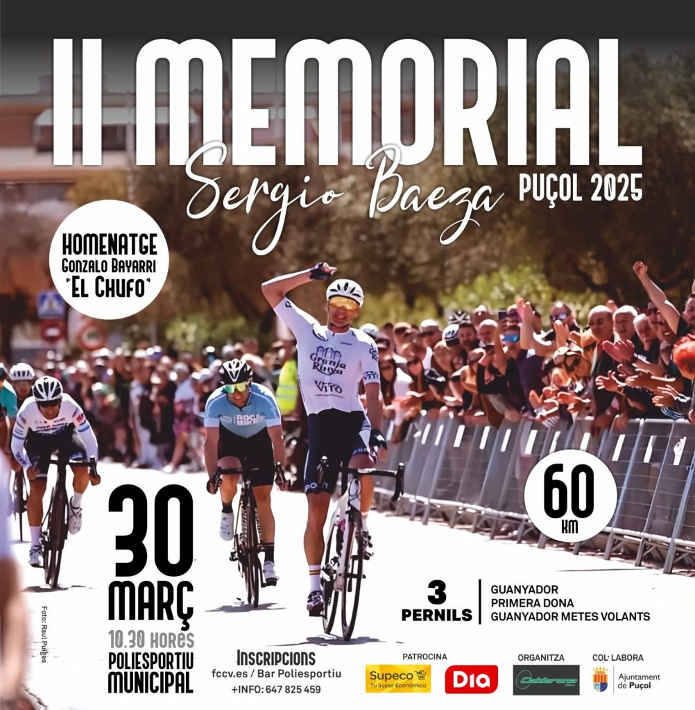 El domingo, 30 de marzo, se disputa en Puçol el II Memorial Sergio Baeza que homenajeará a Gonzalo Bayarri «El Chufo». La salida está prevista a las 10.30h y serán 60 kilómetros de recorrido.