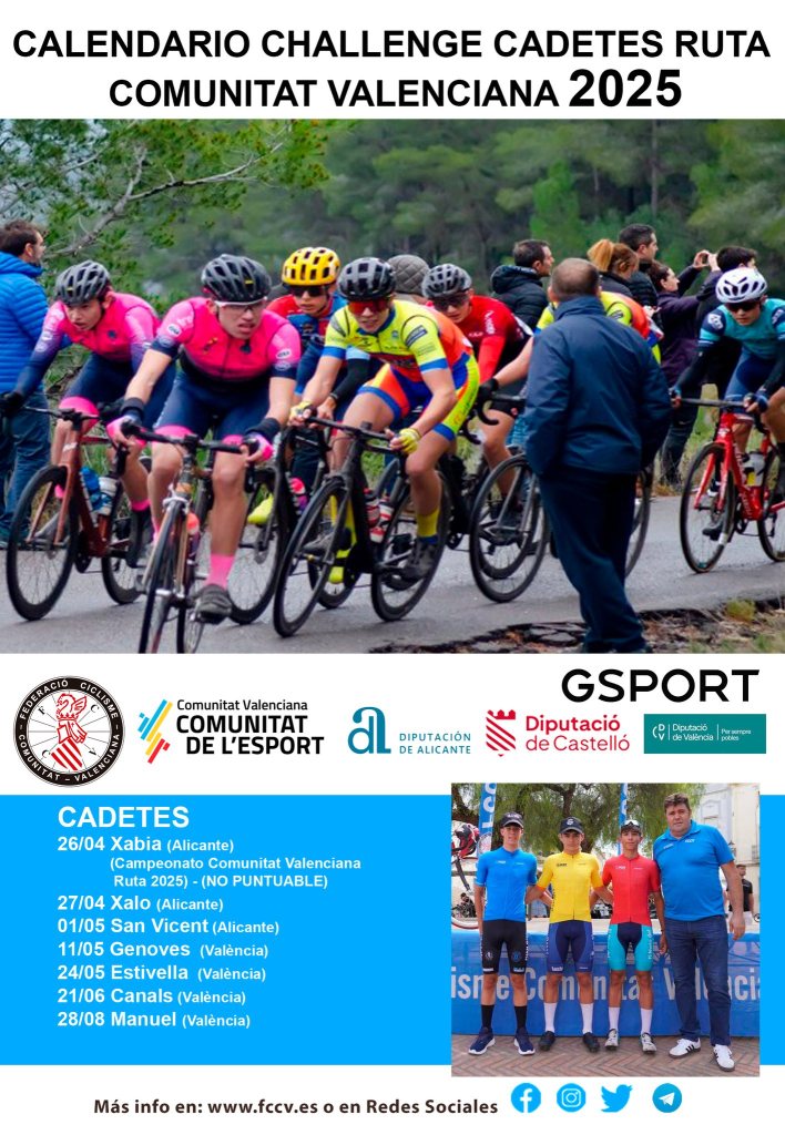 La Challenge de Cadetes de Ruta de la Comunidad Valenciana comenzará el 27 de abril en Xaló y el pelotón buscará el sustituto de Asier Fortea, vencedor de la edición de 2024. Una jornada antes, el 26 de abril, Xàbia acogerá el 𝗖𝗮𝗺𝗽𝗲𝗼𝗻𝗮𝘁𝗼 𝗱𝗲 𝗹𝗮 𝗖𝗩 𝗱𝗲 𝗙𝗼𝗻𝗱𝗼, prueba que no es puntuable para el Torneo.