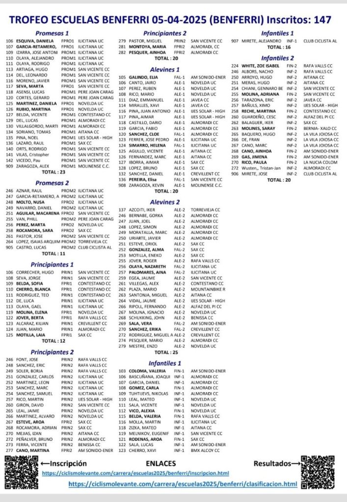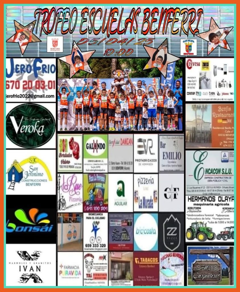 El sábado, 5 de abril, se disputa el Trofeo Escuelas de Ciclismo de Benferri a partir de las 10 horas. La prueba es puntuable para la Challenge de Escuelas de la provincia de Alicante.