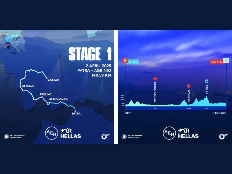 La salida preliminar de la etapa 1 tendrá lugar en la Universidad de Patras a las 13:00 horas. Es la más corta de las cinco etapas del Tour, con una distancia de 140,39 km y un desnivel positivo de 1.243 metros.