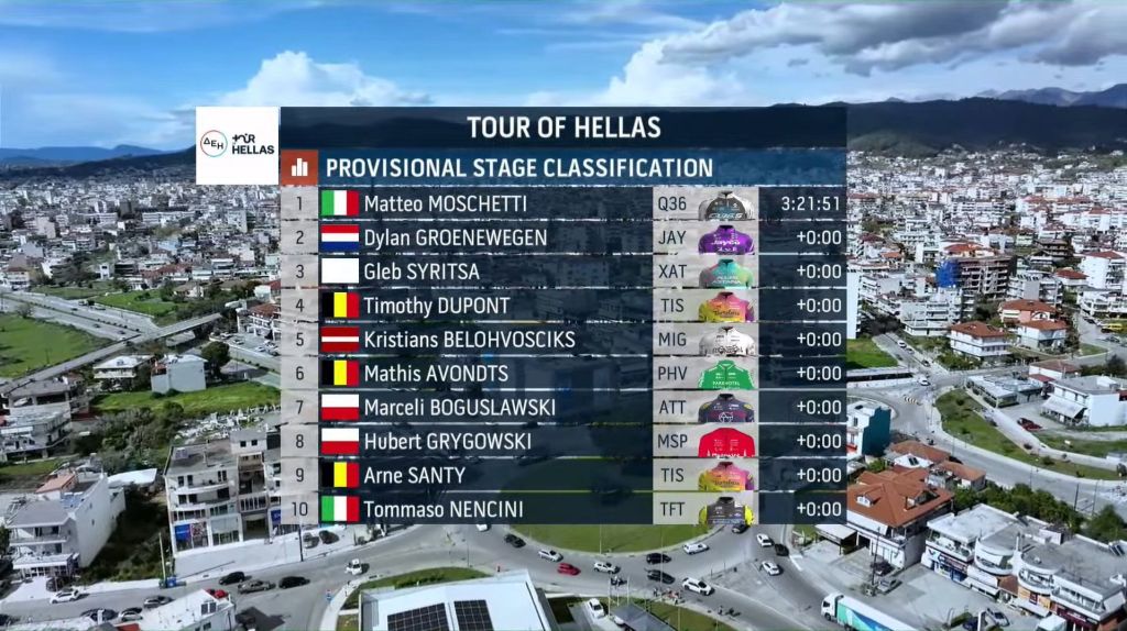 Matteo Moschetti (Q36.5 Pro Cycling Team) ha sido el ganador al esprint de la primera etapa del Tour of Hellas que sse ha disputado hoy entre Patras y Agrinio. Dylan Groenewegen (Team Jayco AlUla) y Gleb Syritsa (XDS Astana) han entrado a continuación. Puesto 35 para Eugenio Sánchez (Victoria Sports Procycling), con el mismo tiempo que el ganador.