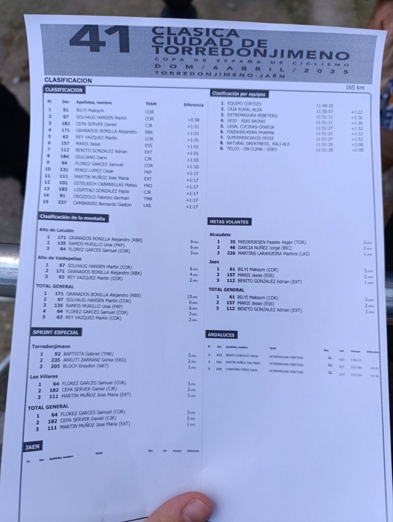 Victoria de Maksym Bilyi (Cortizo) en la Clásica Torredonjimeno. Segunda victoria para el ciclista ucraniano en esta edición 2025 de la Copa de España Élite-Sub23. Martín Solhaug Hansen ha sido segundo, a 58″ del ganador. Daniel Cepa, a 1’01», ha firmado la tercera plaza. Jesse Maris (Essax-SVICO Foundation) termina sexto.