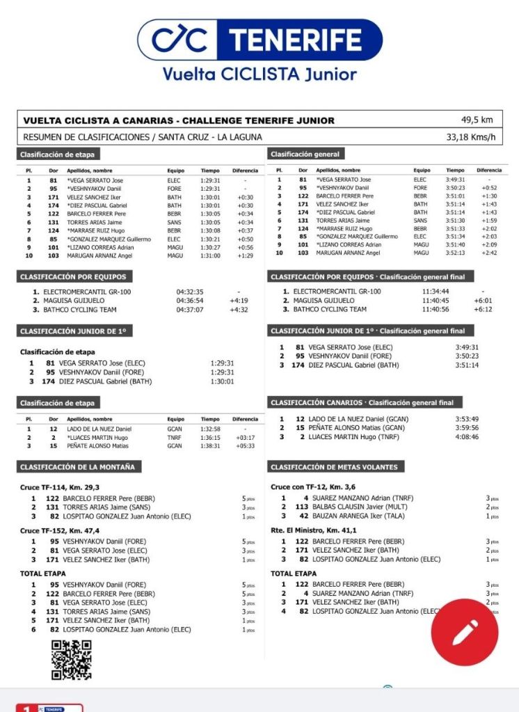 José Vega, Electromercantil GR-100, se ha impuesto también en la 2ª etapa y se adjudica la victoria final de la Vuelta Ciclista Canarias-Tenerife Júnior. El ruso Daniil Veshnyakov, Forés-Electro Hiper Europa, ha terminado segundo tras un largo sprint y 2º en la general.
