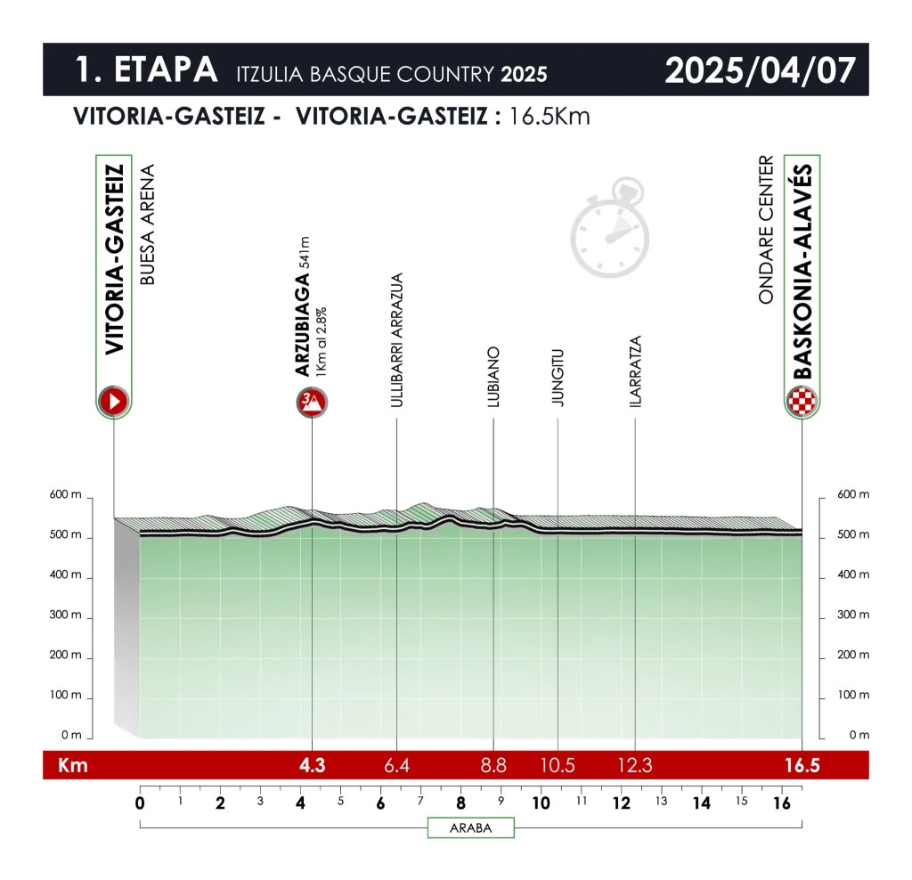 1ª: Lunes 7 abril. Buesa Arena – Vitoria Gasteiz (14:15/17:40), 16.5 km contrarreloj individual