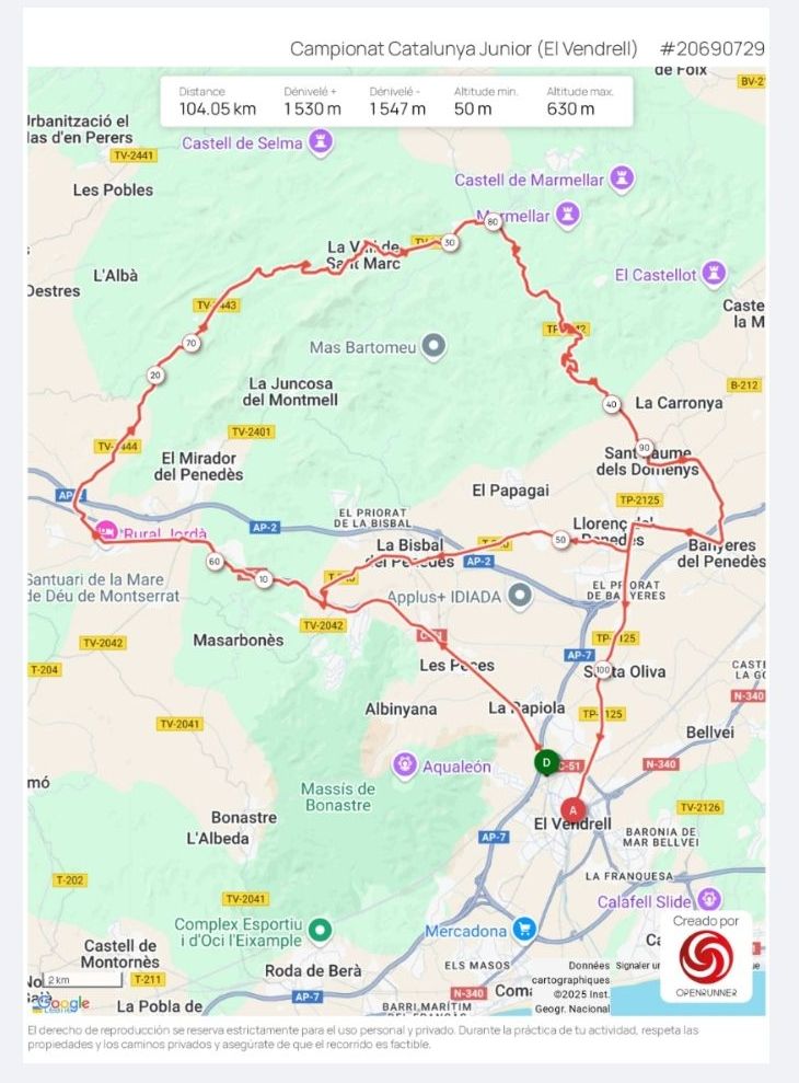 El Vendrell (Baix Camp) acogerá el domingo el XIV GP Baix Penedès – Campeonato de Cataluña junior, organizado por Promoevents. Decidirá el vencedor más preciado de la temporada junior en Cataluña. Lo hará en un recorrido de 104 kilómetros que partirá desde El Vendrell en dirección norte y pasará por Rodonyà, Sant Jaume dels Domenys, Llorenç del Penedès y La Bisbal del Penedès. Después de los diez primeros kilómetros se entrará en un circuito para el que se realizarán dos pases y será el grueso de la prueba. Después de realizar las dos vueltas, y antes de volver a Llorenç del Penedès, la carrera se desviará hacia El Priorat de Banyeres para volver a encarar hacia El Vendrell.