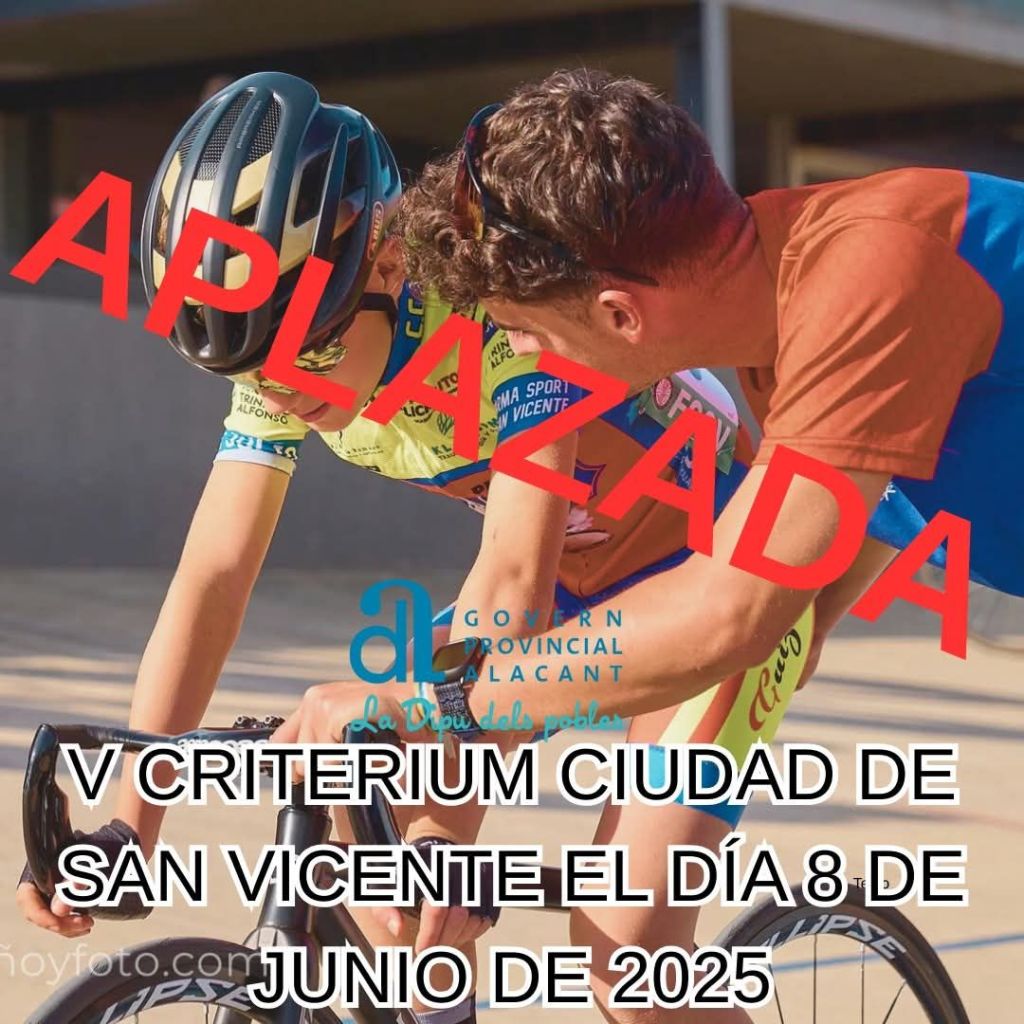 El Club Ciclista San Vicente anuncia que el V Criterium Ciudad de San Vicente para corredores Cadetes y Juveniles, previsto para el 1 de mayo, se ha aplazado al domingo día 8 de junio, por motivos organizativos.