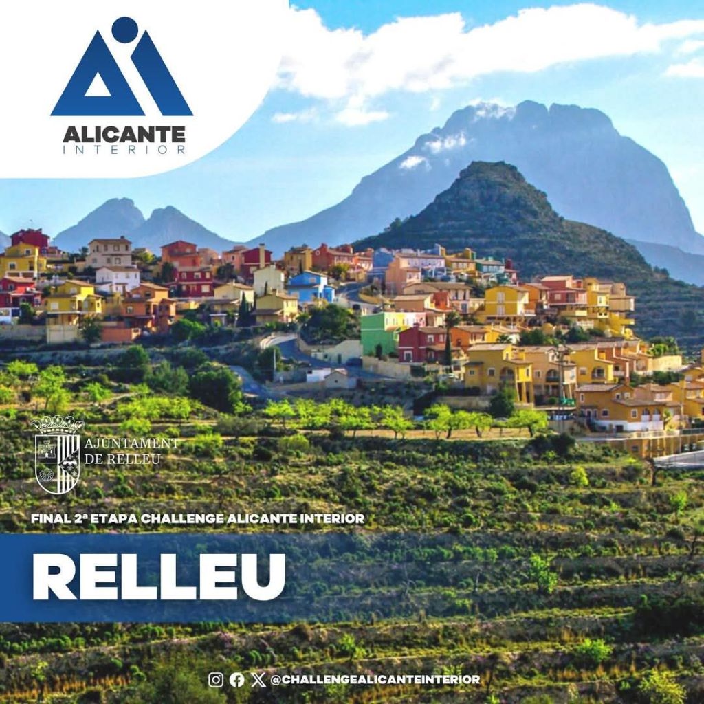 Relleu será sede de la segunda etapa de la Challenge Alicante Interior el próximo 17 de mayo. Situado en el centro de un valle rodeado de montañas como el Cabeçó d’Or, la Sierra de la Grana, y la Sierra del Aguilar, es sin duda un lugar ideal para celebrar una de las etapas de esta edición y llegar a una de las localidades más atractivas de la provincia y hacer referencia a su nombre Relleu “relieve” en valenciano por su orografía.