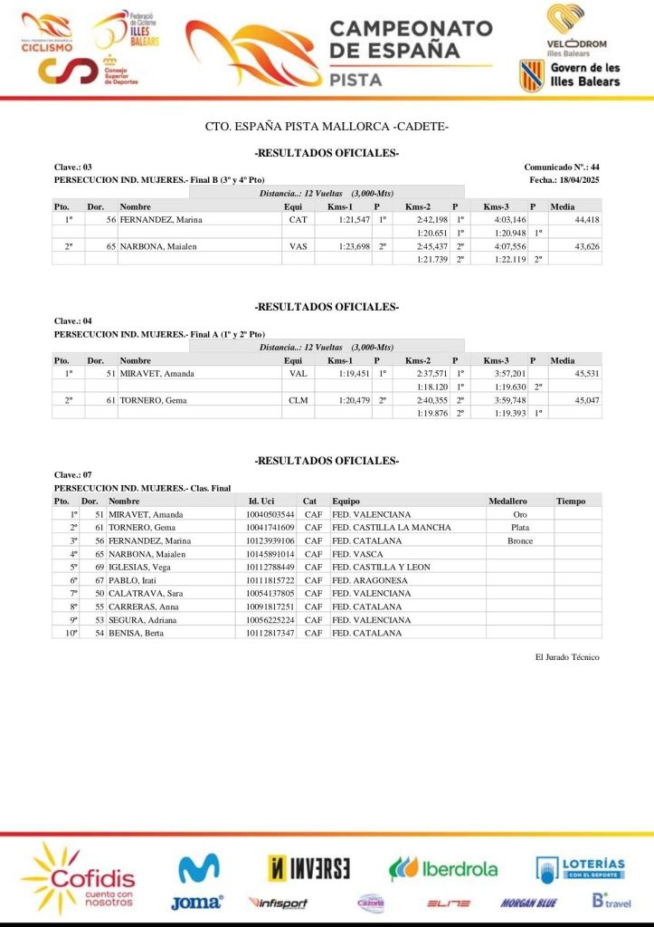 La corredora de la FCCV Amanda Miravet conquista el título de Persecución Individual Cadete. Gema Tornero ha sido segunda y Marina Fernández, tercera.