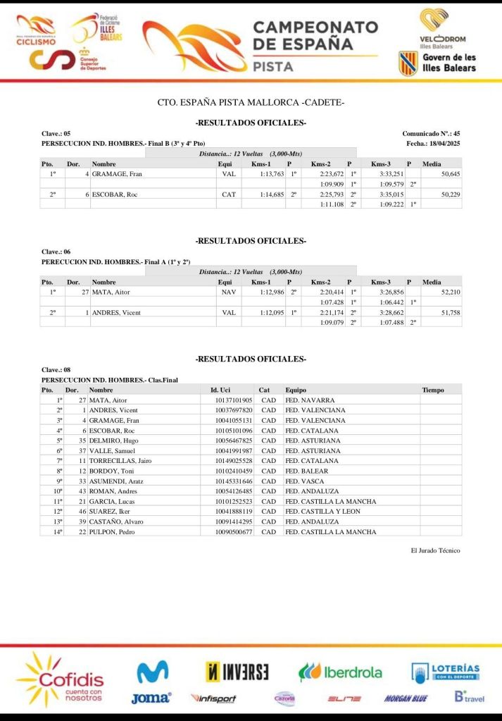 El navarro Aitor Mata se lleva el título de Persecución Individual Cadete. Plata y bronce para los corredores de la FCCV Vicent Andrés y Fran Gramage.