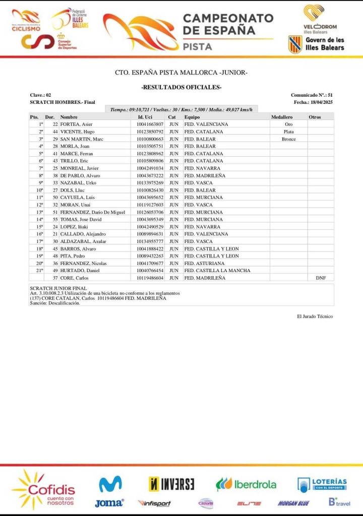 Asier Fortea se adjudica el título de campeón de España junior de Scratch. Hugo Vicente y Marc San Martín han terminado segundo y tercero.