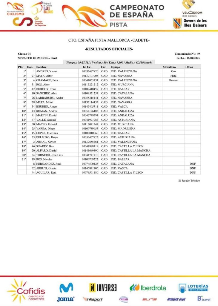 El valenciano Vicent Andrés se viste como campeón de España Cadete de Scratch. Fran Gramage ha sido bronce. Aitor Mata se ha llevado la plata.