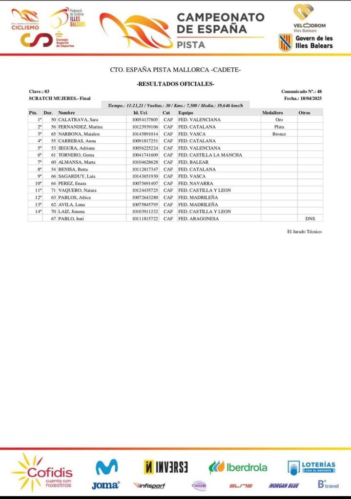 La valenciana Sara Calatrava, tras un ataque a mitad de prueba, se lleva el título de campeona de España Cadete de Scratch. Le han acompañado en el podio Marina Fernández y Maialen Narbona.