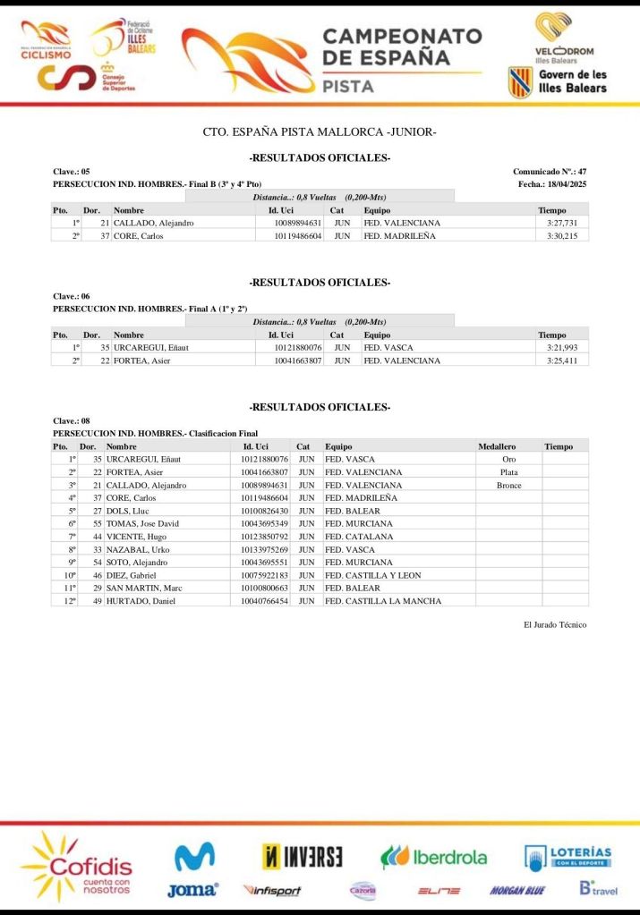Por su parte, Eñaut Urcaregui se lleva el título de Campeón de España Junior de Persecución Individual. Plata y bronce para los pistards de la FCCV Asier Fortea y Alejandro Callado.