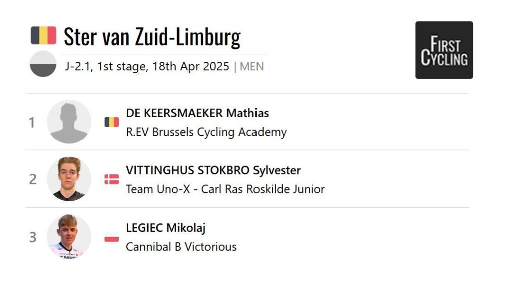 Mathias De Keersmaeker (Brussels) se ha impuesto en la primera etapa de la Trixxo Ster van Zuid-Limburg y se ha vestido de líder. Silvestre Vittinghus (Team Uno).y Mikolaj Legiec han éntrado a continuación.