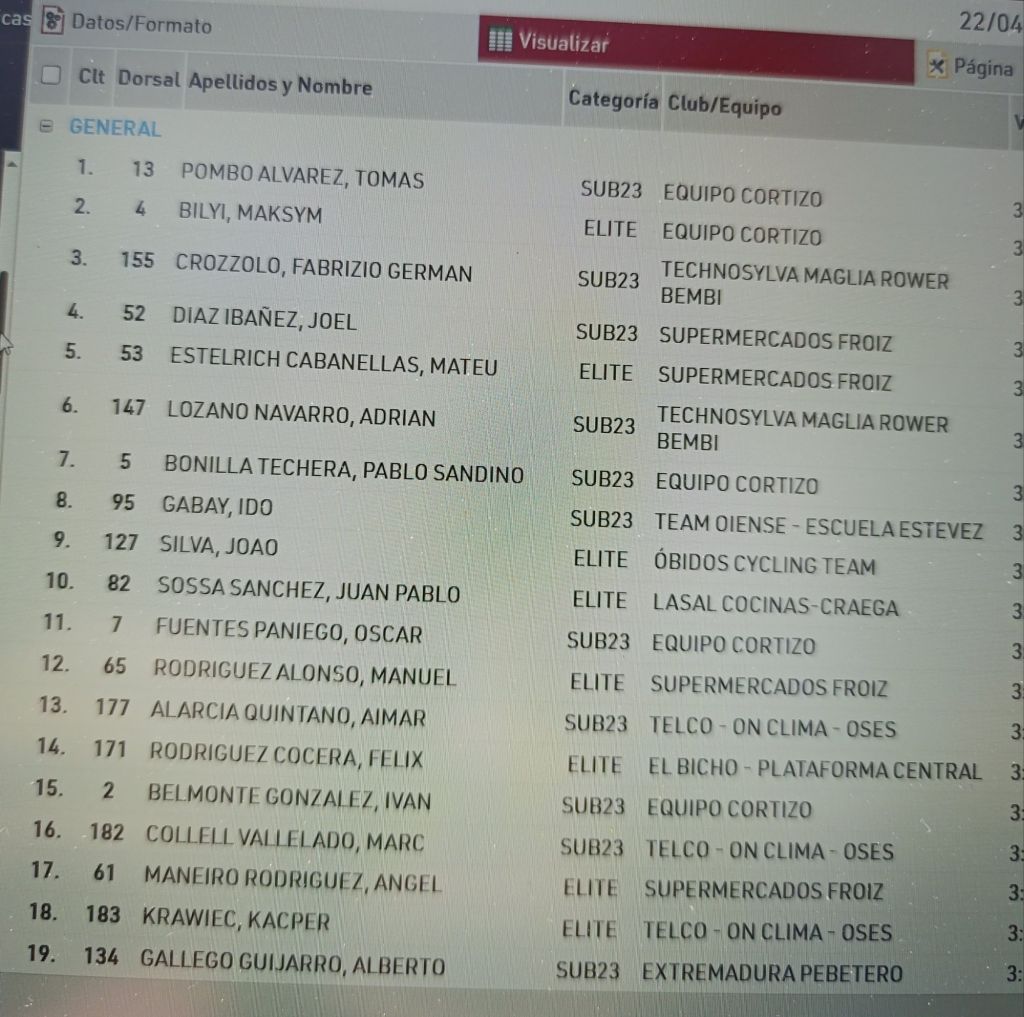 Tomás Pombo (Cortizo) ha logrado el triunfo en solitario en la 62 Clásica de Pascua disputada esta mañana en Padrón. Han completado el podio, de la prueba que abría la Copa Galicia Élite y sub-23 de ciclismo, Maksym Bilyi (Cortizo) y Fabrizio Germán Crozzolo (Technosylva MRB). Pombo se ha llevado el premio de la Montaña; Miguel Rodriguez (Froiz), las Metas Volantes; Fernando Cambarelli (Lasal Cocinas), los SE; y el Cortizo ha sido la mejor escuadra.