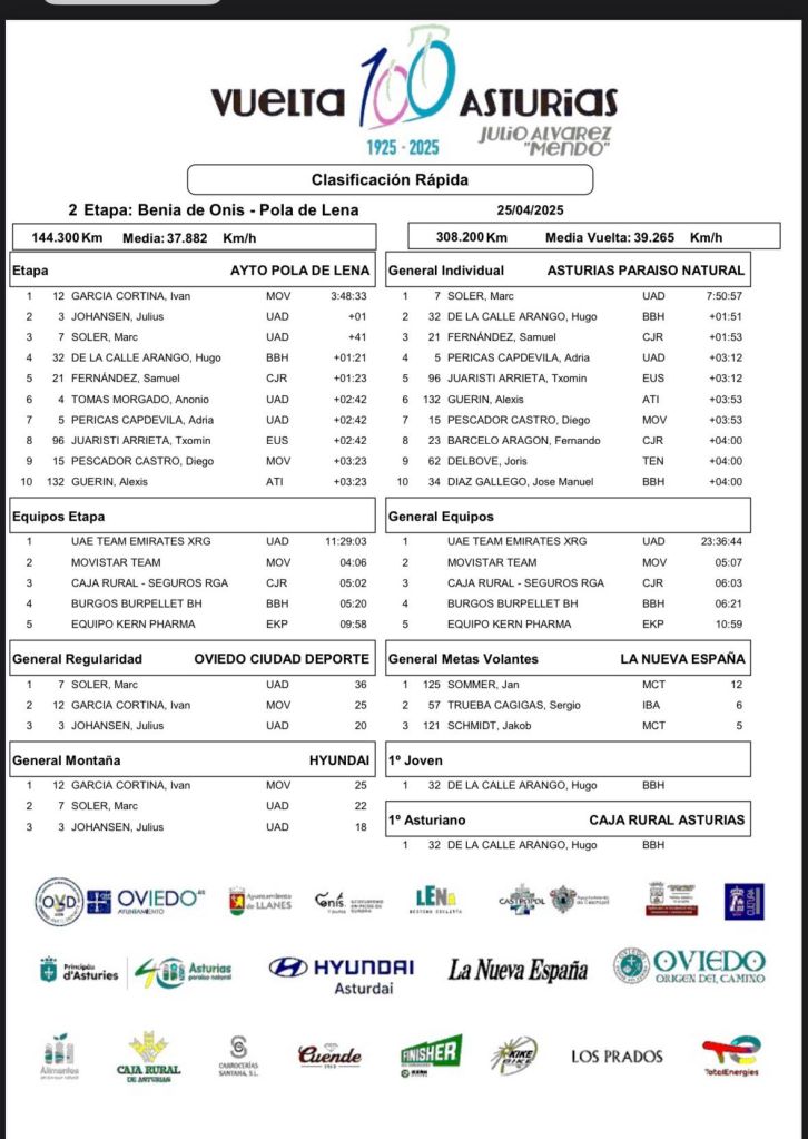 Iván García Cortina, profeta en su tierra, ha conquistado la segunda etapa de la Vuelta a Asturias. Lo ha hecho tras una larga e intensa escapada, en la que fue distanciado y volvió para superar al sprint al corredor de UAE Team Emirates XRG Julius Johansen. Por su parte, Marc Soler es el líder de la carrera tras el abandono de Steff Cras, ganador en la jornada inaugural.