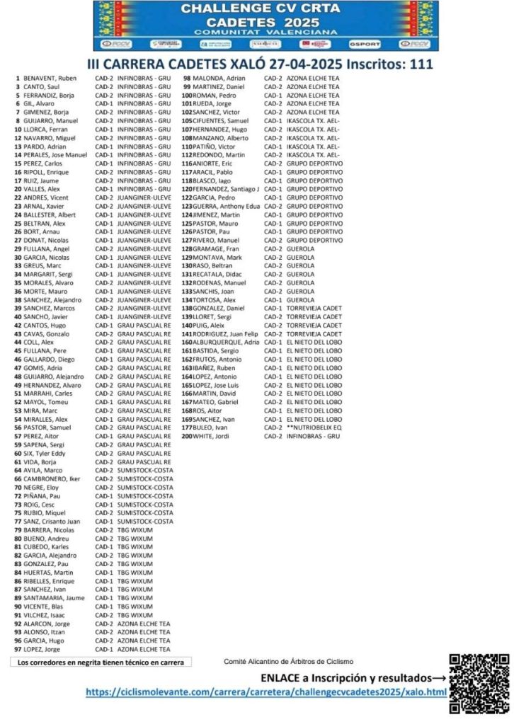 Hoy se disputa, a partir de las 10 horas, el II Trofeu Cadete Villa de Xaló, puntuable para la Challenge de Ruta de la Comunidad Valenciana. La prueba, organizada por el Club Ciclista Bernia Xaló, cuenta con 111 participantes.