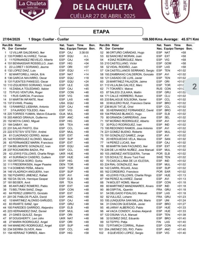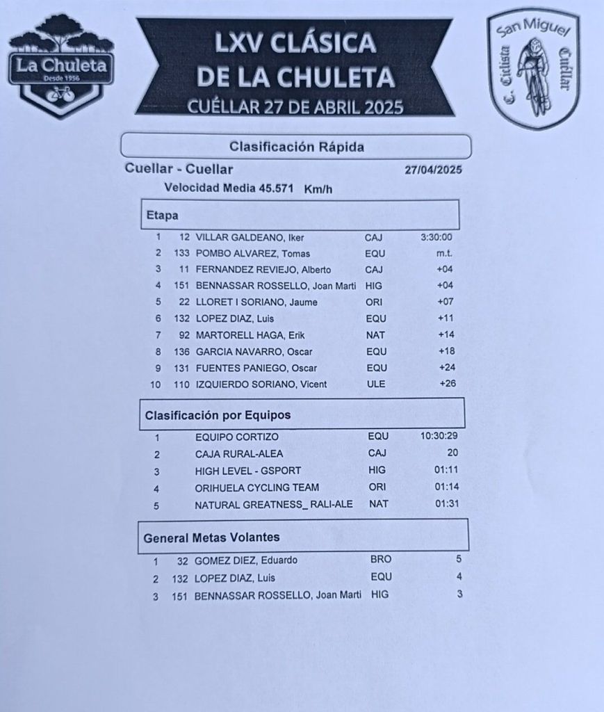 Iker Villar (Filial Caja Rural-Alea) se ha impuesto hoy en Cuéllar en la LXV Clásica de la Chuleta. Tomás Pombo ha terminado segundo y Alberto Fernández. Joan Martí Bennassar (High Level-Gsport) finaliza cuarto y un gran Jaume Lloret (Orihuela Cycling Team) acaba quinto tras una espectacular carrera. Eduardo Gómez ha vencido en las Metas Volantes y el Cortizo ha sido la mejor escuadras.