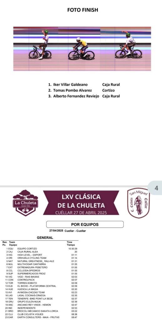 Iker Villar: “Estoy muy contento, llevaba ya un tiempo persiguiendo esta victoria, la primera para mí con el equipo. Habíamos planteado la carrera para estar atentos a los cortes desde el principio, pero sabíamos que había un repecho muy duro y en la segunda vuelta se ha apretado mucho. Arriba había un pequeño páramo y con el viento nos hemos podido ir un grupo en el cual nos hemos metido Rafa y yo. Hemos ido a relevos una escapada de calculo yo 100 kilómetros casi y al final ha sido una guerra muy loca. Ha podido entrar también Alberto y en el sprint gracias a los compañeros y a la tranquilidad que me han dado, porque al final tienen más experiencia que yo, he podido ganar»