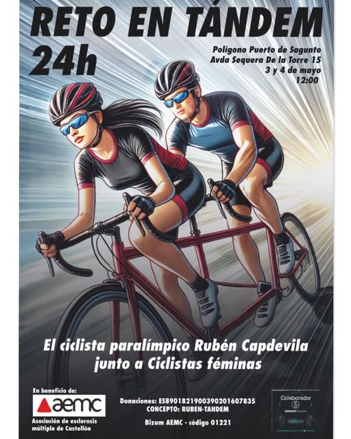 El Reto en Tándem de 24 horas, con Rubén Capdevila como protagonista principal y acompañado de ciclistas féminas, ya está aquí. El ciclista paralímpico invidente, Capdevila, realizará el este fin de semana un reto rodando en tándem durante 24 horas a favor de la Asociación de la esclerosis múltiple de Castellón. Del 3 al 4 de mayo, en en Polígono del Puerto de Sagunto, Av/ Sequera De la Torre 15, estará rodando durante 24 horas.