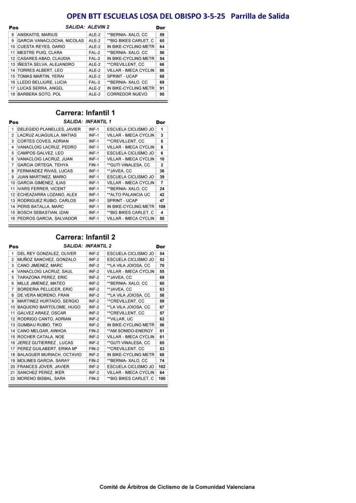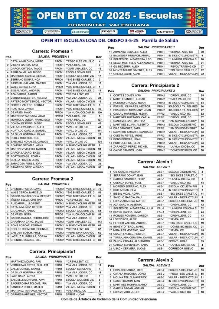 Lideran la general del torneo escolar Elía Ruiz (In Bike) y Héctor Gil (Cabedo), en Alevines 1; Vega Morales (AM Sonido) y Marc Marín (Orbel), en Alevines 2; Iria Baquero (La Vila) y Guillén Verdú (La Vila), en Principiantes 1; Ylenia Callau (Vall d’Uixó) e Iván Cortés (Crevillent), en Principiantes 2; Luna Wals (Big Bikes) y Alejandro Olaya (UC Ilicitana), en Promesas 1; Nusa Moltó (UC Ilicitana) y Bernat García (Big Bikes), en Promesas 2; Theya García (Guti Vinalesa) y Javier Delegido (Sabater), en Infantiles 1; y Ainhoa Cano (AM Sonido) y Oliver del Rey (Sabater).