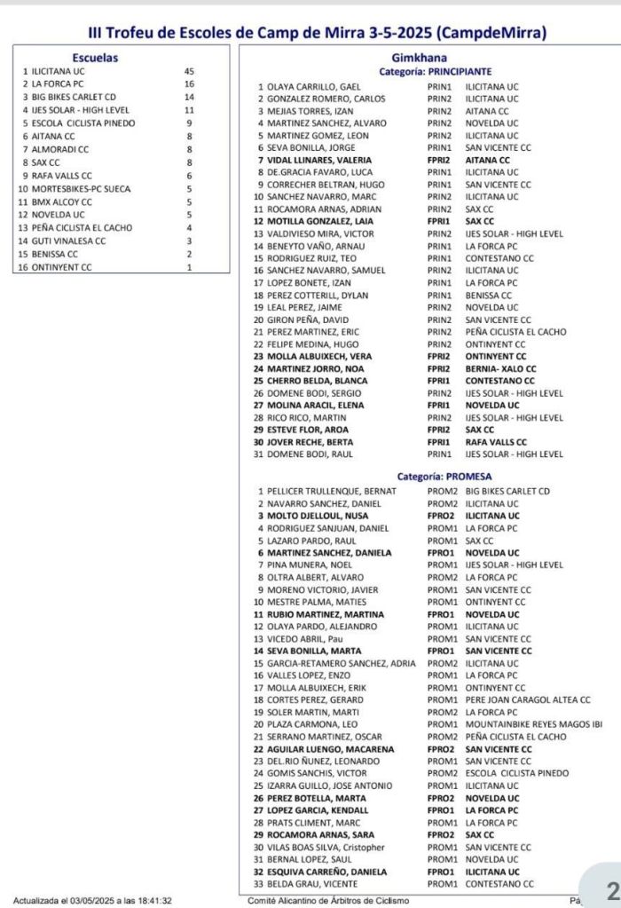 03/05 III Trofeu Escoles de Ciclisme. El Camp de Mirra. Clasificaciones