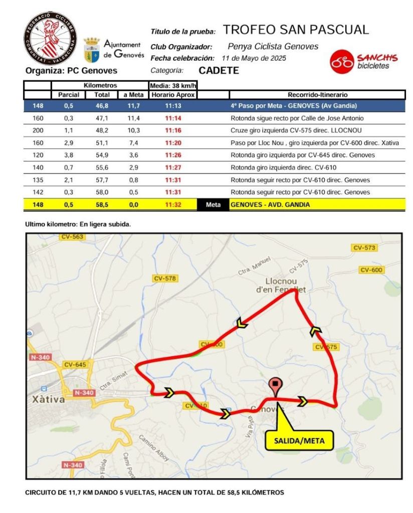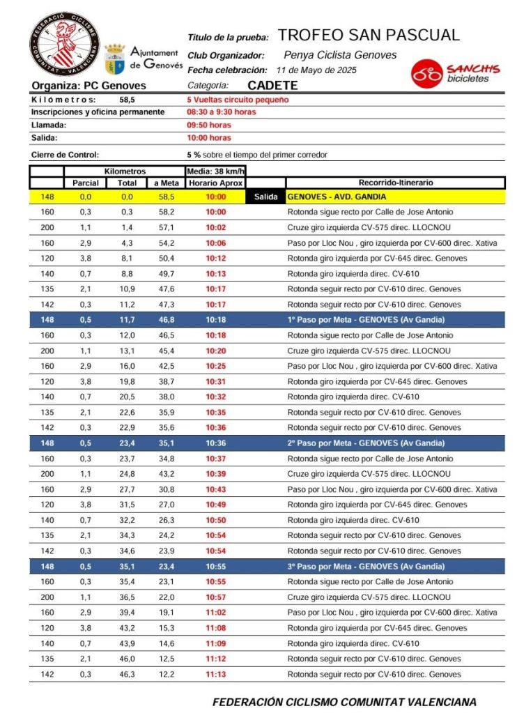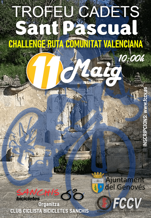 El domingo, 11 de mayo, Genovés recibe a la Challenge de Ruta de la Comunidad Valenciana de Cadetes. El Trofeu San Pascual, organizado por el CC Bicicletes Sanchis, dará comienzo a las 10 horas. Se ha diseñado un circuito de 11,7 kilómetros al que se darán cinco vuelta hasta completar los 58,5 km. fijados para la jornada.
