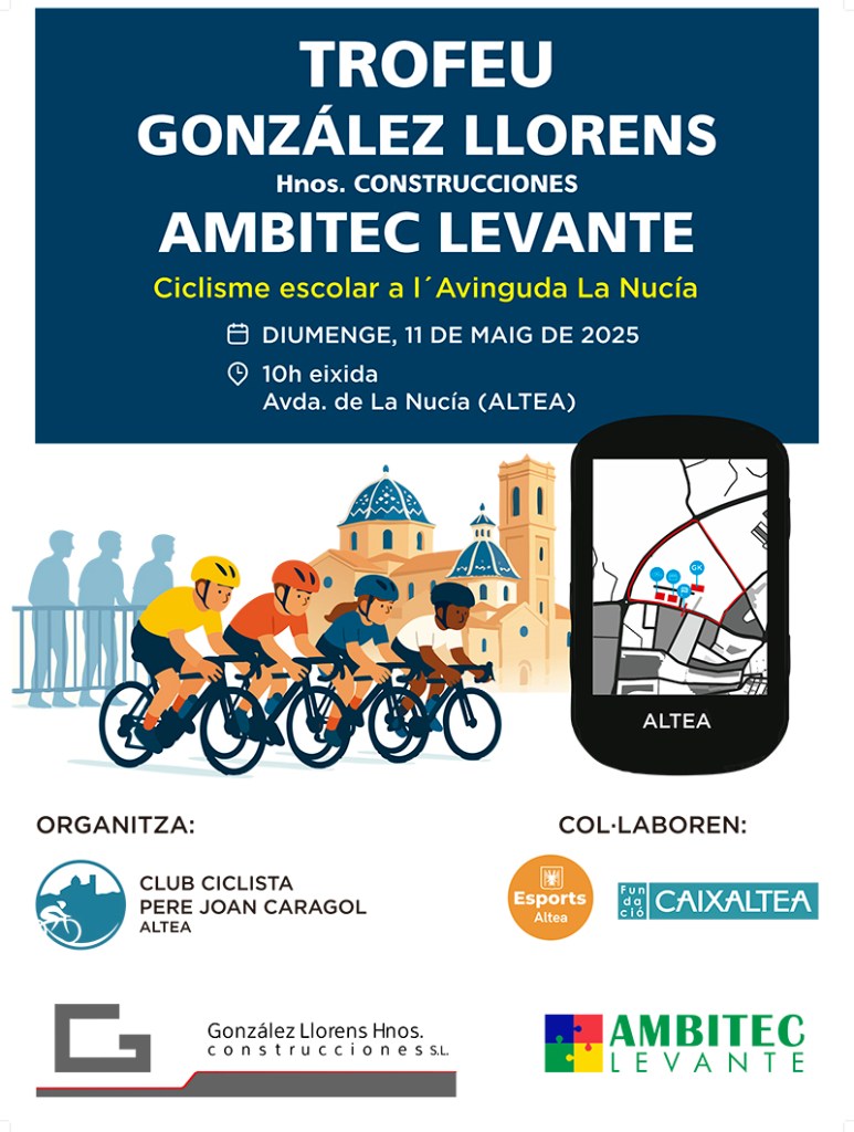 La concejalía de Deportes de Altea y el Club Ciclista Pere Joan Caragol han anunciado una nueva edición del Trofeo González Llorens de ciclismo escolar. La cita es el próximo domingo 11 de mayo en la Avda. de La Nucía a partir de las 10:00 h. Como ha indicado el edil de área, Sara Soler, «llega un año más a Altea el Trofeo González Llorens de Escuelas de Ciclismo, organizado por el Club Ciclista Pere Joan Caragol y con él podremos disfrutar del ciclismo base durante la mañana del próximo domingo».