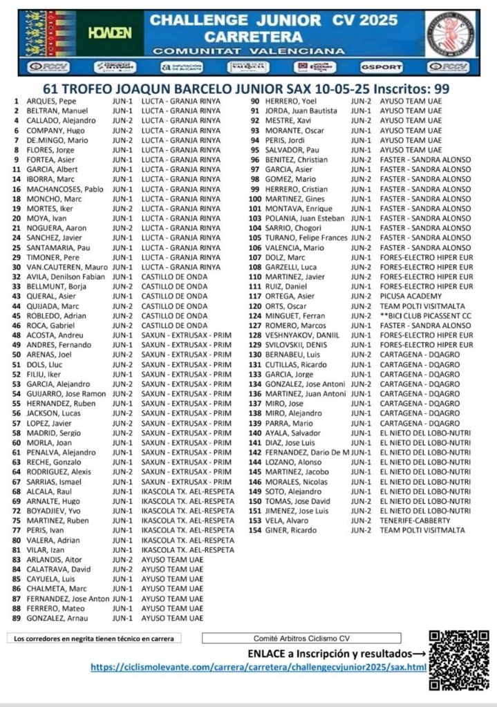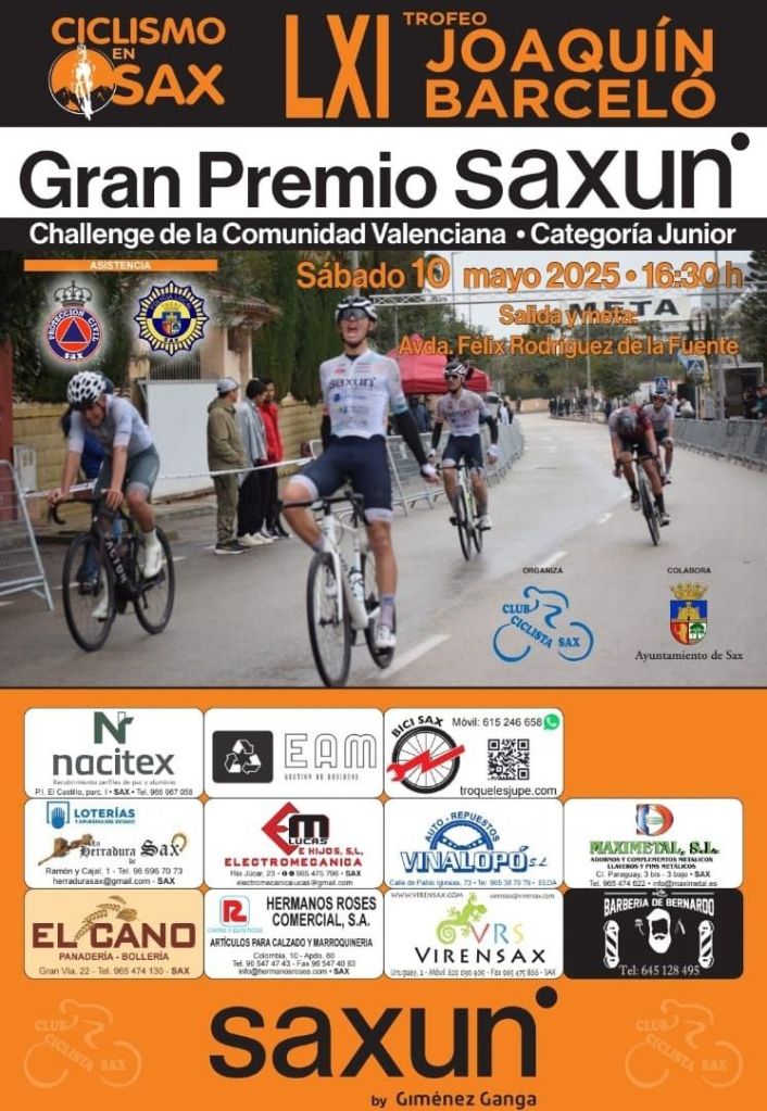 El sábado, 10 de mayo, se disputa en Sax el LXI Trofeo Joaquín Barceló. La prueba, puntuable para la Challenge Júnior de Ruta de la CV, dará comienzo a las 16.30 y está organizada por el CC Sax. Serán 98 kilómetros de recorrido ya que se darán 12 vueltas a un trazado de 8 Km. entre la Vereda de Cémara y la Carretera de Salinas.