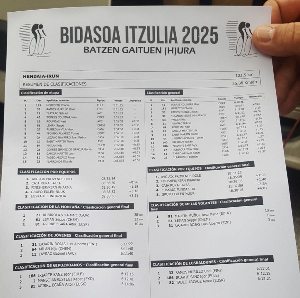 Charlie Meredith (Jira Bira) se ha impuesto en Irún, desde la escapada, en la tercera y última etapa de la Bidasoa Itzulia que ha partido de Hendaia y ha tenido 102,5 kilómetros de recorrido. Marc Torres (Cortizo) se adjudica la General. Han llegado cuatro escapados y ahí se ha decidido el triunfo parcial y el de la prueba.