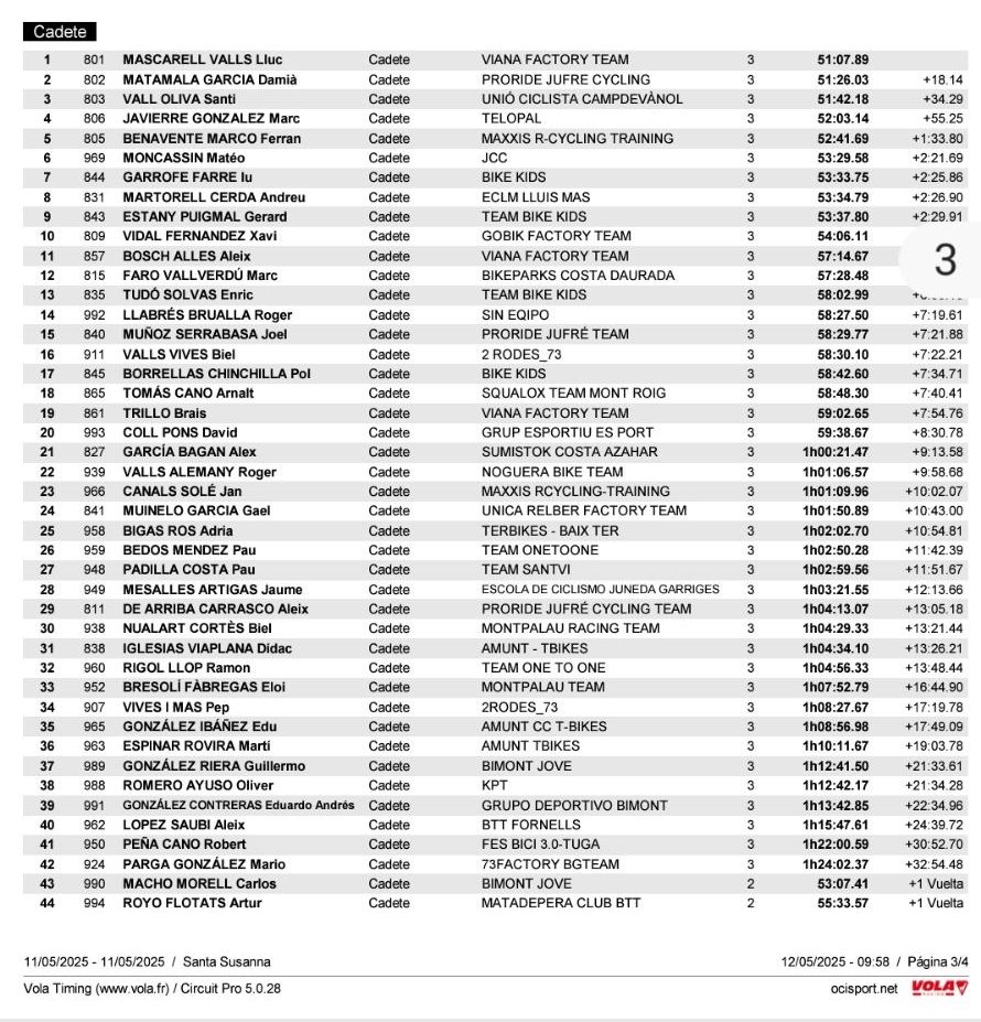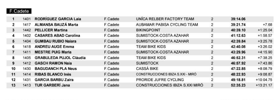 En la categoría Cadete femenina, Carolina Casares se rehizo después de una aparatosa caída y finalizó la prueba en cuarta posición. Naiara Gumbau siguió su estela y completó la prueba en quinta plaza y María Mestre y Naia Gasch terminaron en el top-10. Buena actuación de las ciclistas del Sumistock Team.
