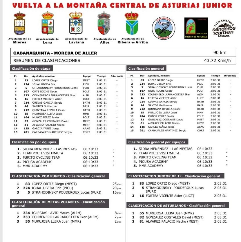 Diego López (Sidra Menéndez-Las Mestas) logró ser profeta en su tierra en la primera etapa de la Vuelta Ciclista Montaña Central de Asturias para ciclistas Júnior. López era el más rápido al esprint por delante de Eric Igual (Picusa Academy) y Lucas Strahodinsky (Purito Cycling Team). Óscar Orts (Polti) ha sido cuarto y Asier Fortea (Lucta-Granja Rinya), sexto.